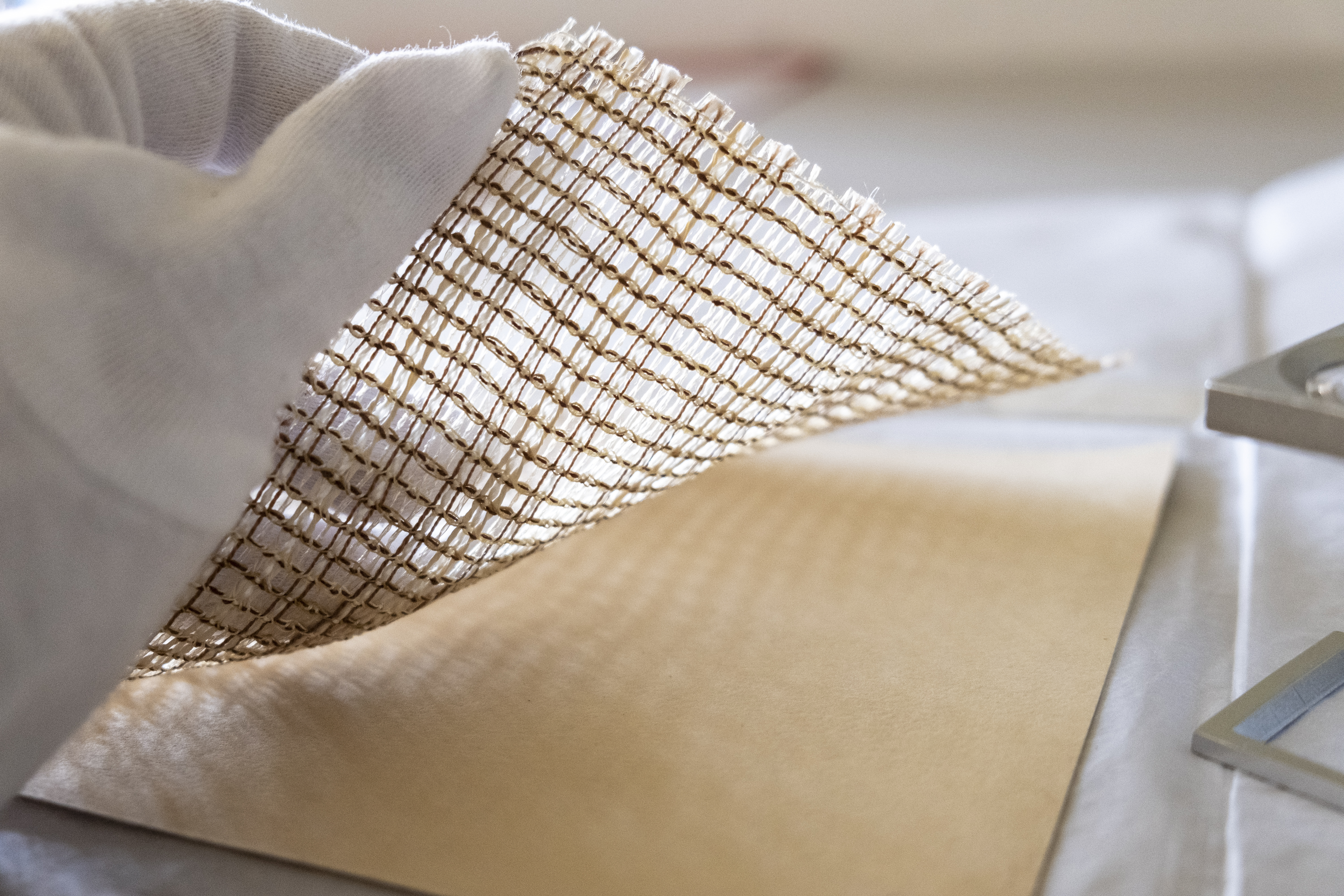 Schon 1929 setzten die textilen Werkstätten der Kunstgewerbeschule unter der künstlerischen Leitung von Hans Wittwer synthetische Fasern ein, um das Dienstzimmer des Landeshauptmanns der Provinz Sachsen in Merseburg auszustatten. Hierfür wurden Wandspannstoffe aus Rohr, Flauschseide, Jute und Cellophan gefertigt.2 In einem Werbeprospekt (um 1930/31) mit dem Titel „Raumstoffe. Weberei der Werkstätten der Stadt Halle“3 wurden unter anderem Gewebe mit Cellophan sowie chemisch hergestellte Fasern wie Viskose und Vistra beworben. Viskose ist ein zellulosebasiertes Material, das zwar aus Pflanzenfasern gewonnen, jedoch in chemischen Mitteln wie Natronlauge, Kupferammoniumhydroxid oder Kohlenstoffdisulfid gelöst wurde, wodurch eine viskose Masse entstand.4 Aufgrund des seidig-glänzenden Aussehens und haptischen Eigenschaften wurde Viskose auch als „Kunstseide“ bezeichnet.