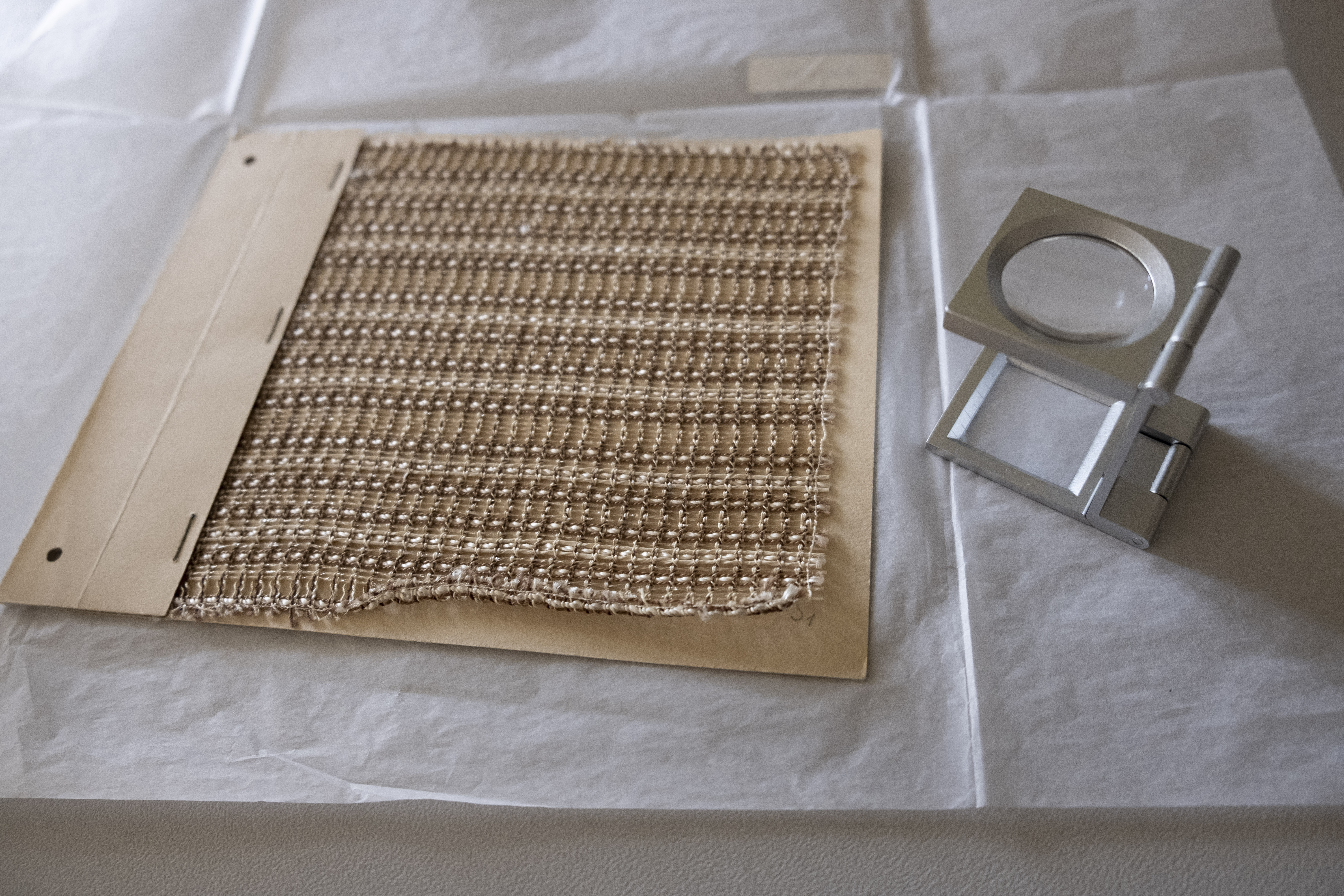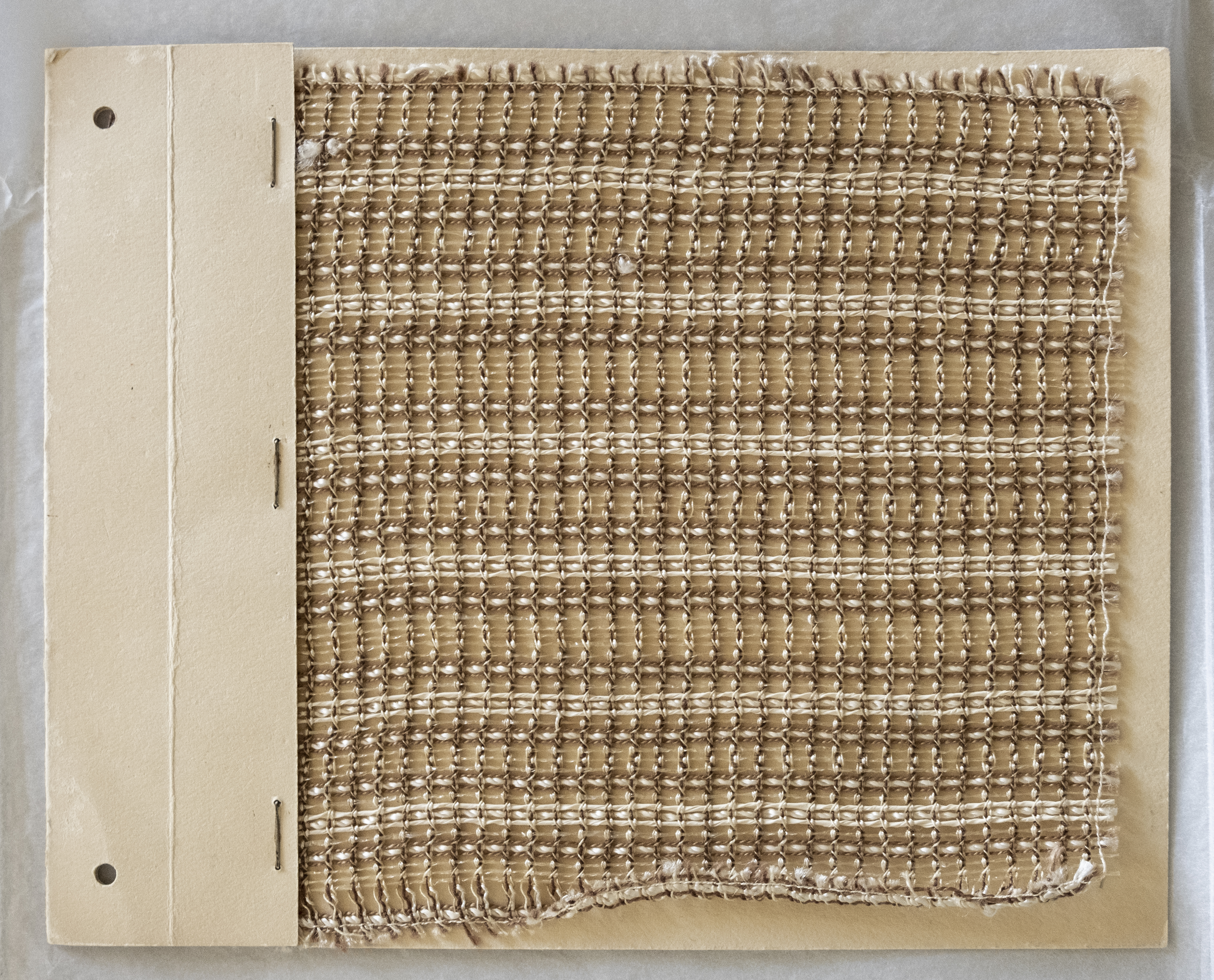 Das Musterstück für ein Drehergewebe hat eine Gesamtgröße von 15 x 17,5 cm und ist in einem Rapport13 von ca 4,5 cm in der Höhe und 1 cm in der Breite, 30 Schussfäden und 8 Kettfäden, gefertigt. Das hier gezeigte Musterstück ist ein Halbdreher, der oftmals in den flächenbildenden Drehergeweben verwendet findet, im Gegensatz zum Volldreher, der lediglich an Kanten von Geweben eingesetzt wird.14 Drehergewebe im allgemeinen zeichnen sich durch ihre charakteristische Lichtdurchlässigkeit und Schiebefestigkeit aus, da sie zu den engsten Fadenverkreuzungen der Webtechnologie gehören. Dafür muss der Webstuhl über eine spezielle Vorrichtung verfügen, in der die Kettfäden in Steherfäden und Dreherfäden auf den Schäften eingeteilt werden. Im praktischen Sinne umschlingen die Dreherfäden die Steherfäden; passiert dies nach jedem Schusseintrag werden diese als „1-schüssige“ Dreherbindungen bezeichnet. Über die genaue Ausstattung der Webereiwerkstatt zur Zeit Koch-Ottes und Arten der Dreherwebstühle ist wenig bekannt. So verweist die Kunsthistorikerin und Architektin Angela Dolgner in „Benita Koch-Otte an der Kunstgewerbeschule Burg Giebichenstein in Halle“ auf einen Zeitungsbericht von 1929 der Saalezeitung, der lediglich von 15 Webstühlen unterschiedlicher Art schreibt. Jedoch verweist die Autorin auf ein Gespräch mit einer ehemaligen Schülerin der Textilklasse, die sich an 4 Dreherwebstühle in der Werkstatt erinnert.15 Eindrücklich ist die Konstruktion des Kreuzdrehers, da dieser über einen besonders komplizierten Einzug verfügt, für den mindestens zwei Dreherschaftpaare benötigt werden.16 Zusätzlich wird im Einzug, in den Dreherfäden abwechseln, je paar hellbeige und dunkelbeige Baumwolle verwendet.17 In der Konstruktion arbeitet ein Faden jeweils als Hoch- und der andere als Tief-Dreherfaden. Dadurch entsteht eine außergewöhnlich feste Verbindung zwischen Kette und Schuss, was sich insbesondere in der Verwendung glatter bzw. rutschiger Materialien eignet. Innerhalb der Dreherfadenpaare sind die Steherfädenpaare, die optisch eine Leinwandbindung bilden, aus dunkelbraunem Garn (vermutlich Baumwolle) und weiß-glänzender Viskose eingezogen. Insbesondere der 30er-Schussrythmus besticht durch die Verwendung zahlreicher Garne. Neben der Verwendung von natürlichen Materialien, wie Baumwolle, finden sich auch synthetisch hergestellte Fasern, wie Viscose sowie Cellophan und „Plastefäden“, in diesem Musterstück. Wovon etwa Eindrittel eines Rapportes in Schussrichtung des nahezu durchsichtigen Cellophan verwendet wurde. Dies führt zu einer besonders lichtdurchlässigen und leichten Ästhetik. Besondere Steifigkeit entsteht durch die Verwendung der insgesamt 4 beigen Plastefäden. Diese sind ähnlich wie das Cellophan leicht gedreht. Farbliche Tiefe entsteht durch die Verwendung von Baumwollschussgarn in dunklem Braun, 8 Schuss pro Rapport, wie auch durch insgesamt 6 im Rapport gleichmäßig verteilten Schüssen weiß-glänzendem Viskosegarns. Das Musterstück diente wahrscheinlich als Vorlage für einen Vorhangstoff oder eine Wandbespannung. Wie bei den meisten noch enthaltenen Gewebemustern im Archiv der BURG, ist auch bei diesem Design unbekannt, welche:r Gestalter:in innerhalb der Werkstatt den Entwurf erstellte. Jedoch ist davon auszugehen, dass der überwiegende Teil der Werkstattentwürfe auf Lehrlinge bzw. Mitarbeitende zurückzuführen ist, da Benita Koch-Otte diese intensiv in den Gestaltungsprozess der Werkstatt einbezog.18 Insbesondere bei der Entwurfsarbeit, die für Kooperationen mit der Industrie gedacht war. Das Drehergewebe zeigt auf ästhetisch-gestalterische Art wie Funktionalität und der Einsatz neuer Materialien mit hochkomplexen Technologien in der Webereiwerkstatt erforscht wurden.